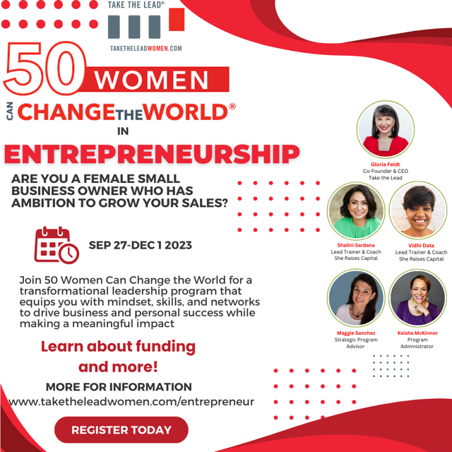 P.S. Whether you apply or not, you can help the cause by sharing on social media: #womenentrepreneurs are ready to scale and this Take The Lead Women 50 Women Can Change the World in #entrepreneurship will be the catalyst. There’s still time to apply but hurry or you’ll miss out! It starts September 27.
